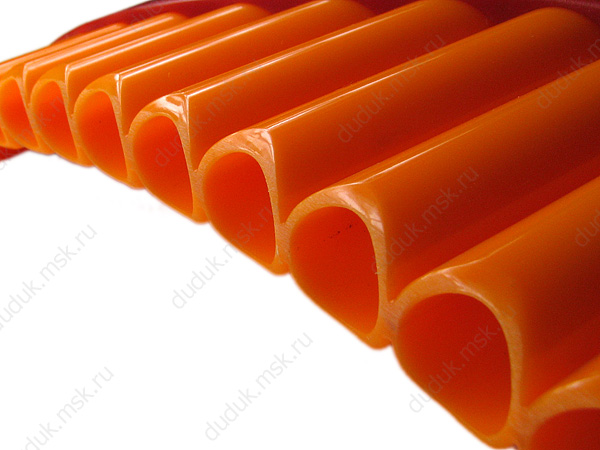 Материал: пластик ABS. Диапазон - две октавы (соль первой – соль третьей), строй диатонический (соль мажор). Панфлейта целиком отлита в пресс-форме, прочная и легкая. Поясок съемный, и выполняет чисто декоративную функцию. Пробки твердые, прозрачные, двигаются. В комплекте чехол.
