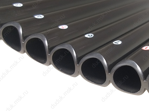 Материал: пластик ABS. Флейта целиком отлита в пресс-форме, прочная и легкая. Настройка – двигающимися пробками.Трубки для удобства пронумерованы. В комплекте прочный чехол. Флейта правосторонняя (большие трубки справа)