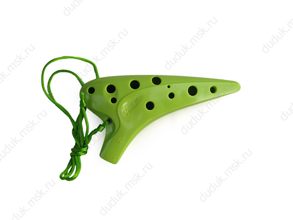 Пластиковая окарина - сопрано. Имеет 12 отверстий. Данная модель специально спроектирована для начинающих и имеет плоскую форму с правой стороны, что делает более удобным перекрытие игровых отверстий. Также, при игре в верхнем диапазоне требуется небольшой расход воздуха, для получения не резкого и достаточно громкого звука. Инструмент неприхотлив и удобен для повседневного использования и ношения. В комплекте коробочка и короткое руководство с аппликатурой.
