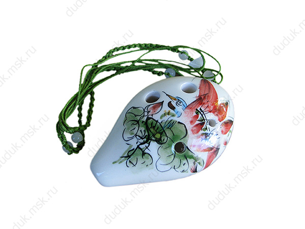 Керамическая окарина - сопрано, выполненная в виде подвески. Имеет 6 игровых отверстий и перекрестную "английскую" аппликатуру, позволяющую извлекать 10 нот в диапазоне от C(до) третьей октавы до E(ми) четвертой. Модель раскрашена вручную. В комплекте коробочка и короткое руководство с аппликатурой.