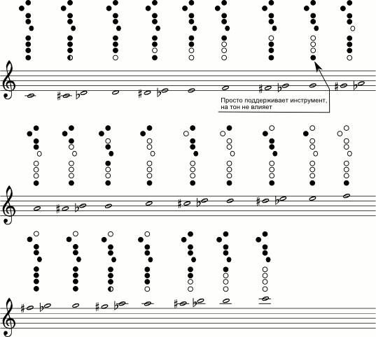 (Вы могли заметить, что "Фа-диез" вроде бы как отсутствует в верхнем регистре. Вы можете получить его просто играя просто "Фа", и прилагая к трости большее давление, чтобы чуть-чуть подтянуть ноту вверх. Некоторые исполнители получают тот же результат, играя высокую "Соль" с меньшим давлением губ на трость.)