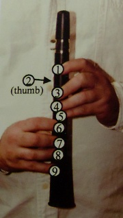 - Средний палец левой руки - согнут только в главном суставе, продолжаясь прямо до отверстия, подушечка пальца закрывает отверстие.