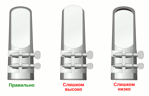 Расположение трости по отношению к краю мундштука критично для качественного звучания. Как показано на иллюстрации слева, края трости должны быть расположены вдоль края мундштука. Если трость расположена слишком низко, звук будет нечетким. Если трость будет расположена слишком высоко, потребуется больше дыхания для того, чтобы она начала вибрировать, а кроме того, она быстрее сломается.